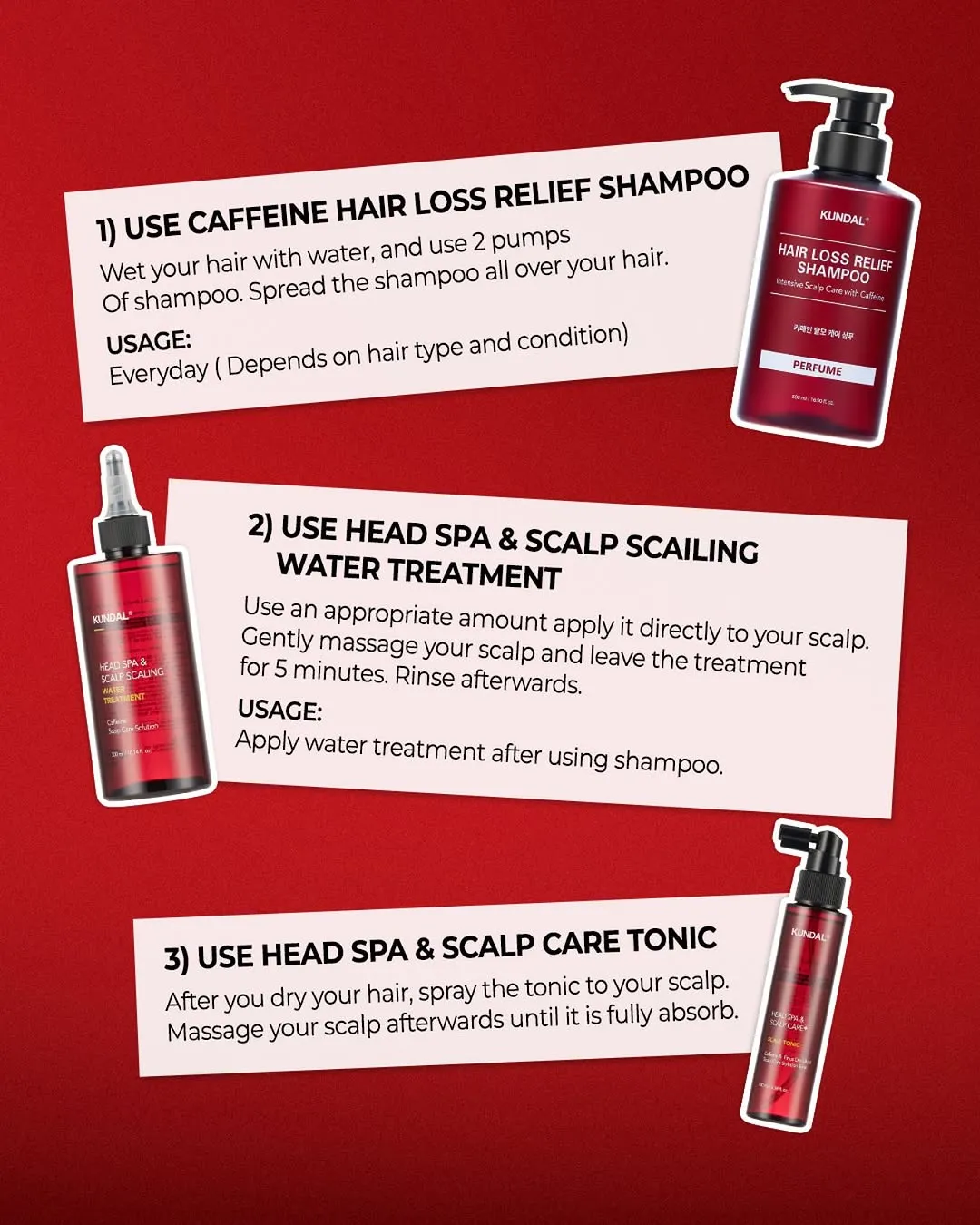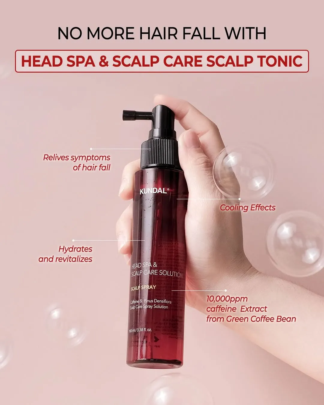Say goodbye to hair fall from its roots with KUNDAL Caffeine Head Spa & Scalp Care+ Tonic Spray!
